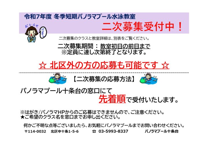 冬季短期パノラマプール水泳教室の二次募集開始のお知らせです。