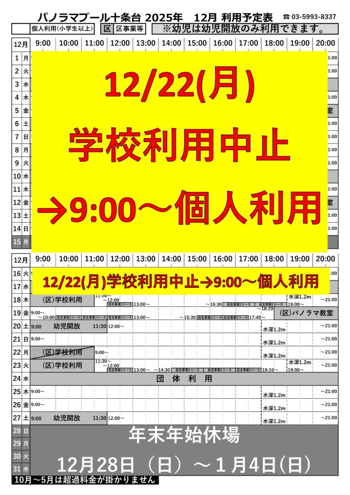 - 2025年12月18日お知らせパノラマプール十条台